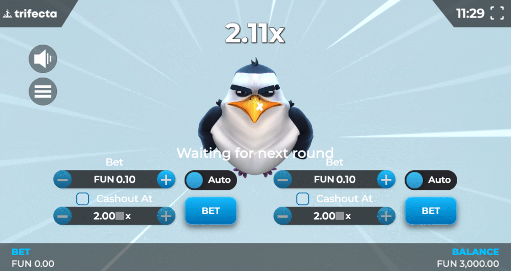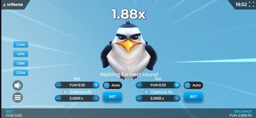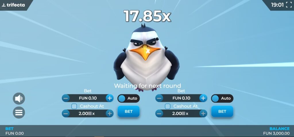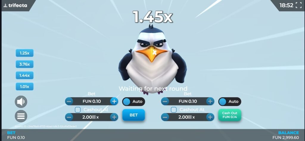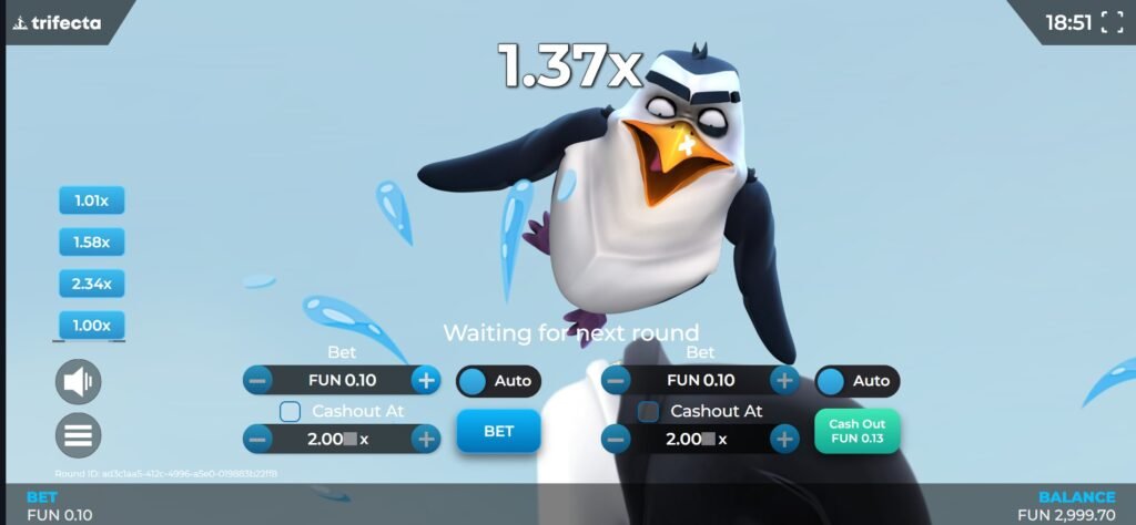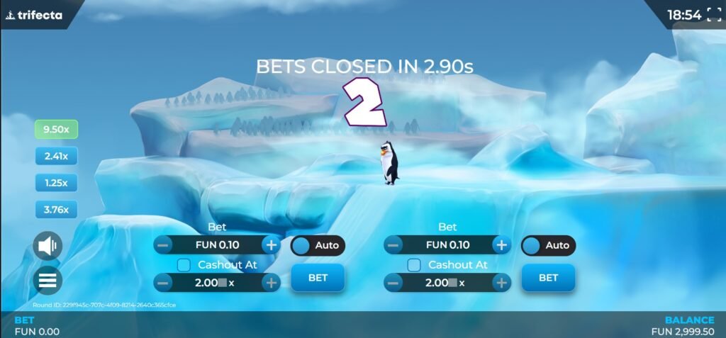 Once stakes and settings are configured, players initiate the round by clicking the “Bet” button. The penguin immediately begins its descent down the icy slope, gathering momentum before taking flight. The multiplier starts at 1x and increases continuously as the penguin soars through the air, with potential wins growing proportionally.